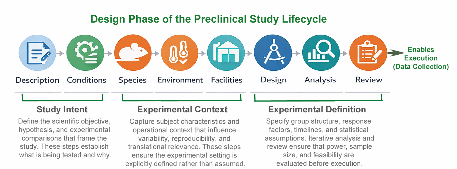 The Study Manager Design module captures experimental intent before execution begins—objectives, group structure, endpoints, and analysis intent—so studies are planned with rigor and carried forward consistently through data collection and reporting.